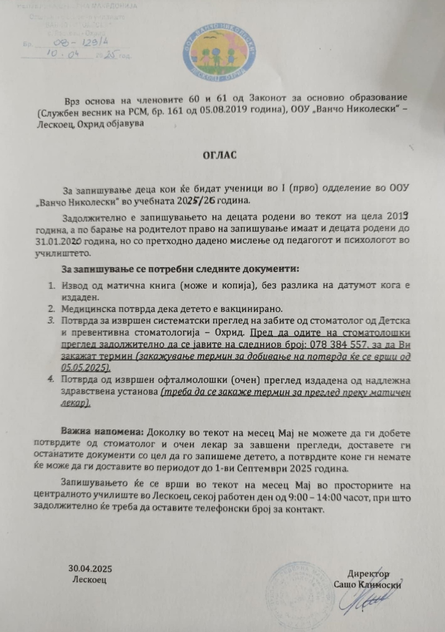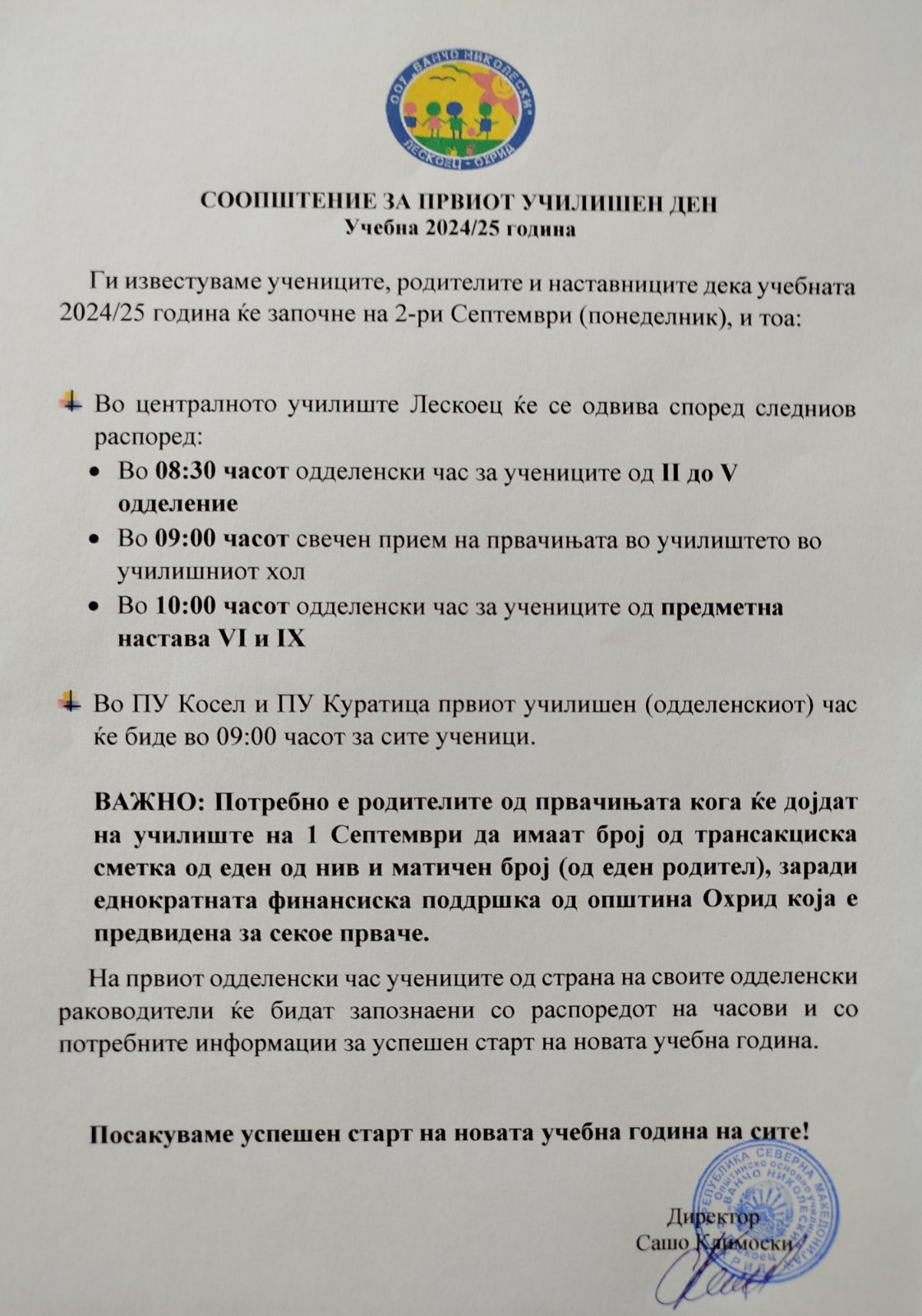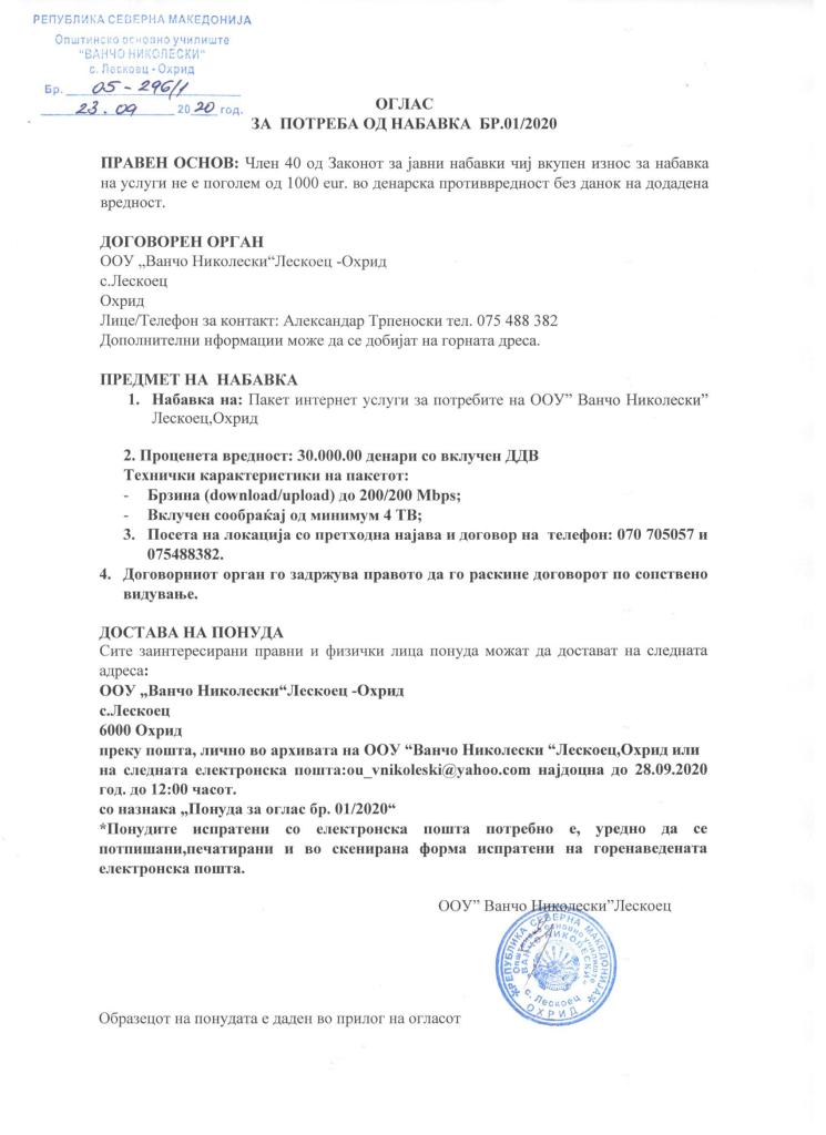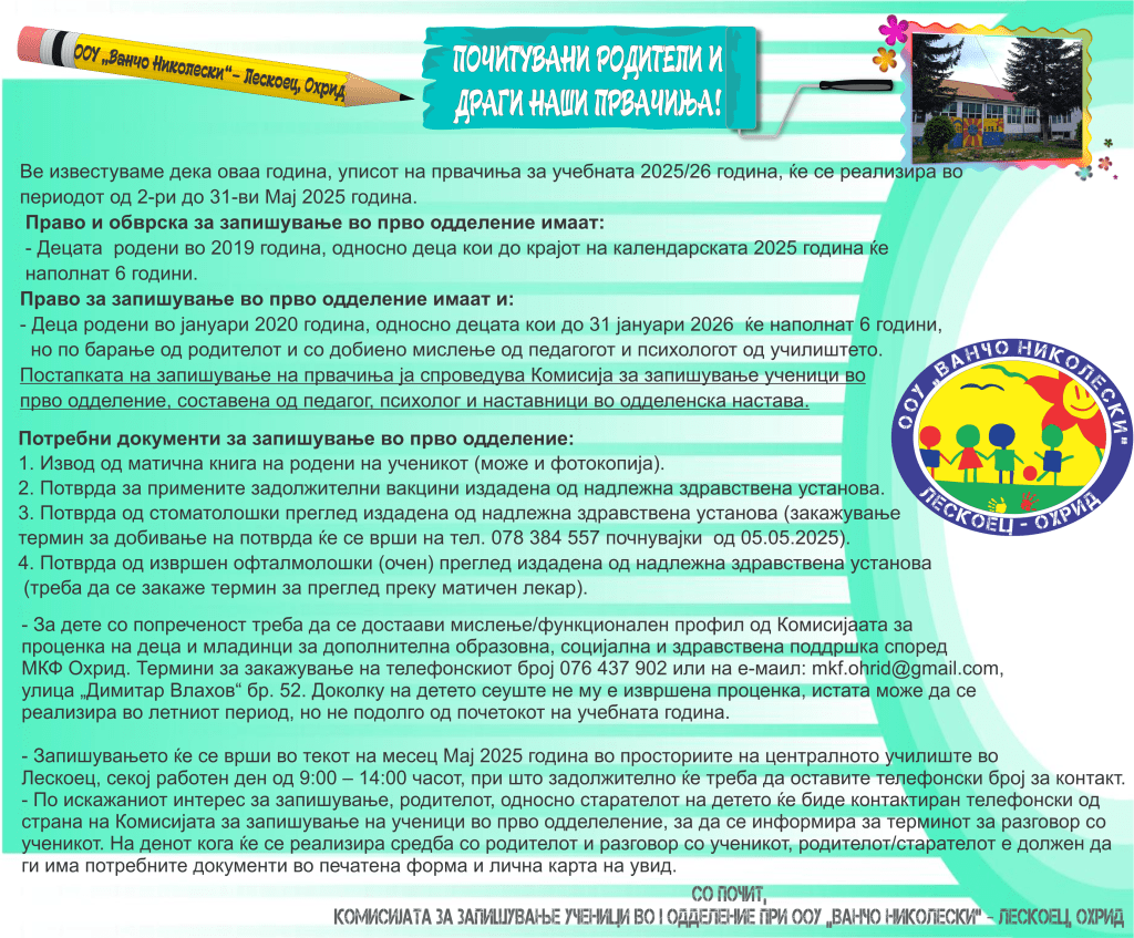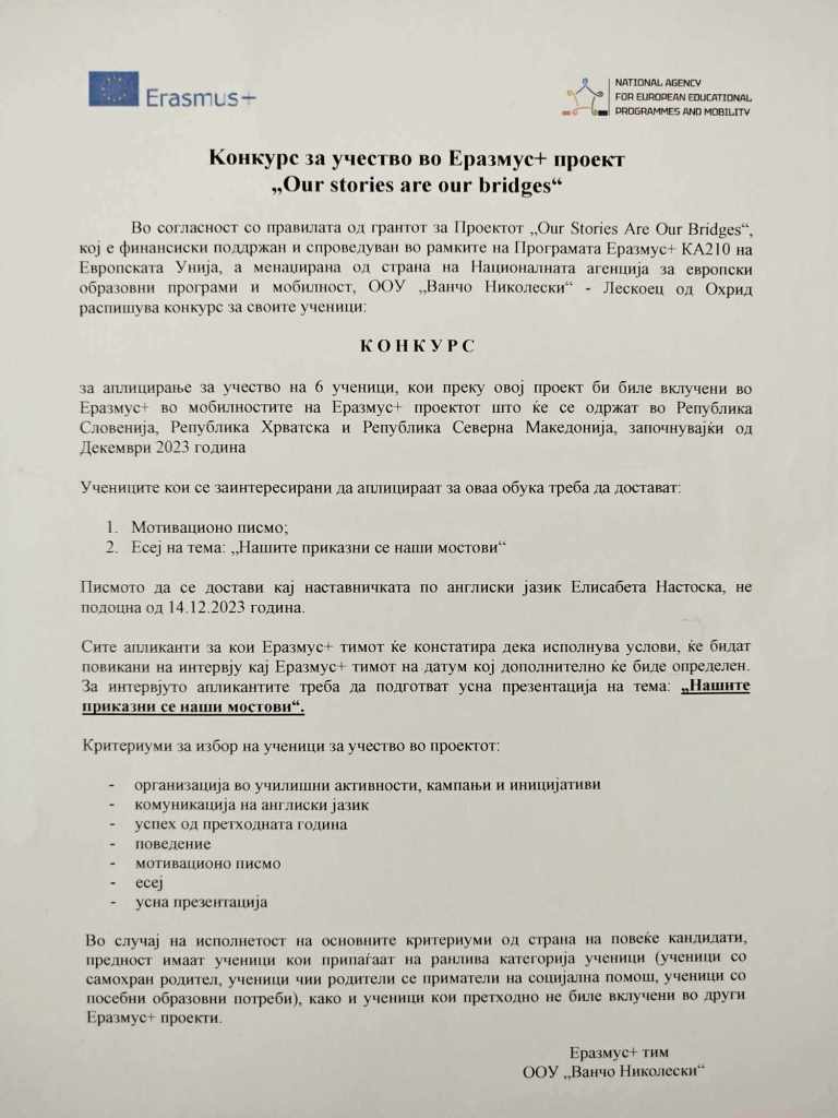 Министерството за наука и образование објави јавен повик за финансиска поддршка за учениците од основните и средните училишта чии семејства имаат вкупни месечни приходи од нето плата до 50.000 денари.Се работи за парична помош за која треба да достават документи, ПРИЈАВА за стекнување со право за финансиска поддршка и ИЗЈАВА за давање согласност таткото, односно мајката да биде подносител на пријавата и за согласност за користење лични податоци. ПРИЈАВАТА и ИЗЈАВАТА родителите може да ги подигнат во стручната служба на училиштето (или да ги испринтаат од веб страната на МОН од линкот што е даден подолу во ова известување), каде ќе им бидат дадени насоки кои документи треба да ги достават заедно со пополнетите пријави и изјави.За да се стекнат со тоа право, освен пријавата и изјавата, родителите ќе треба да достават и:- Копија од трансакциска сметка на еден родител/старател подносител на барањето- Потврда од работодавачот за последно исплатена нето плата на двајцата родители/старатели- Доколку е дете на починат родител доказ-извод од книгата на умрените и чек од пензија- Доколку е дете од разведени родители доказ-решение од правосилна судска пресуда- Доколку е дете на родител пензионер доказ –последен чек од пензија- Доколку е дете на невработен родител доказ – потврда од Агенција за вработување на Република Северна Македонија дека е невработено лице кое не прима паричен надоместок или прима паричен надоместок со наведена сума на паричниот надоместокотНајважно е сега родителите кои знаат дека ги исполнуваат горенаведенте услови за финансиска поддршка на нивните деца, денес (19.12.2023) да дојдат во прва смена во училиштето кај стручната служба или утре (среда 20.12.2023) во било која смена додека е отворено училиштето за да ги подигнат потребните документи и да им се дадат насоки што треба да направат, бидејќи рокот за пријавување е многу краток.Рокот на пријавување на целокупната документација од страна на родителите во училиштето е најдоцна до 24 декември – ЗАДОЛЖИТЕЛНО.Повеќе информации за овој повик може да се најдат на линкот: