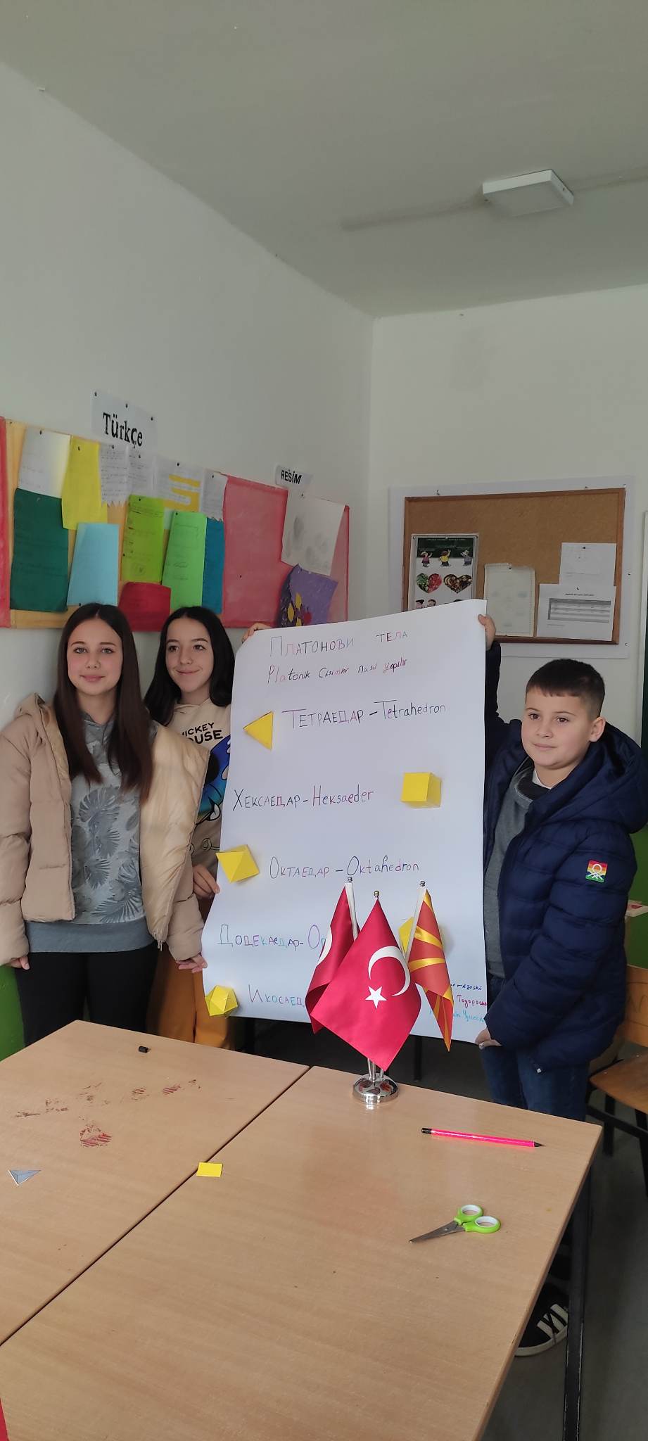 Работилницата по математика беше на тема: ”Карактеристики на 3Д форми”. На работилницата учествуваа 3 наставници и 12 ученици. На првата средба учениците повторија кои 3Д форми ги имаат изучено. Тие ги именуваа и опишаа 3Д формите и нивните карактеристики. Ја објаснуваа и анализираа мрежата на на полиедри (бројот и видовите многуаголници). Потоа ја нацртаа мрежата и направија модели на 3Д форми. На втората средба ги направија хамерите со 3Д форми и истите ќе бидат изложени во училиштата. Учениците се запознаа меѓусебно, соработуваа и учеа математика во опуштена работна атмосфера. Цели на работилницата по математика беа следниве: препознавање, именување и опишување на 3Д формите и некои од нивните карактеристики, објаснување и анализирање на мрежата (бројот и видовите многуаголници) на полиедри, правење модел на секој полиедар и развивање на воочување,заклучување,анализа,синтеза,воопштување.