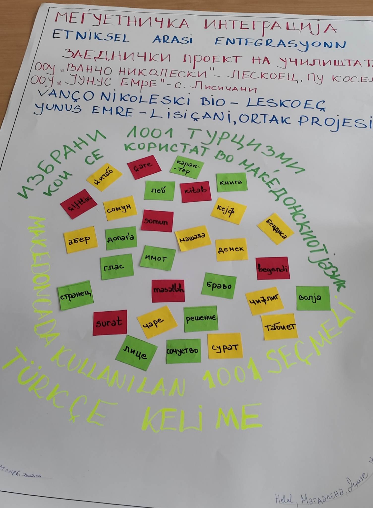 На работилницата по македонски – турски јазик учениците ги истражуваа “Турцизмите во македонскиот јазик”. Во неа учествуваа 3 наставници и 10 ученици. На првата средба после направеното неколкудневно истражување се сретнаа и разговараа за турцизмите во македонскиот јазик. Потоа работеа на тоа како да ги препознаваат турцизмите во даден текст. Направија квиз – натпревар на знаење за турцизмите и нивната примена. Селектираа и избраа почесто користени турцизми и македонски фрази со турцизми и направија три хамери на кои ги прикажаа истите. На втората средба го довршија започнатото и создадоа речник на најчесто користени турцизми во македонскиот јазик.