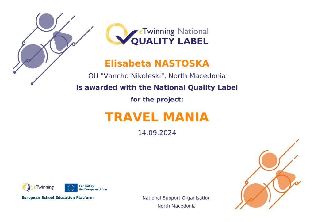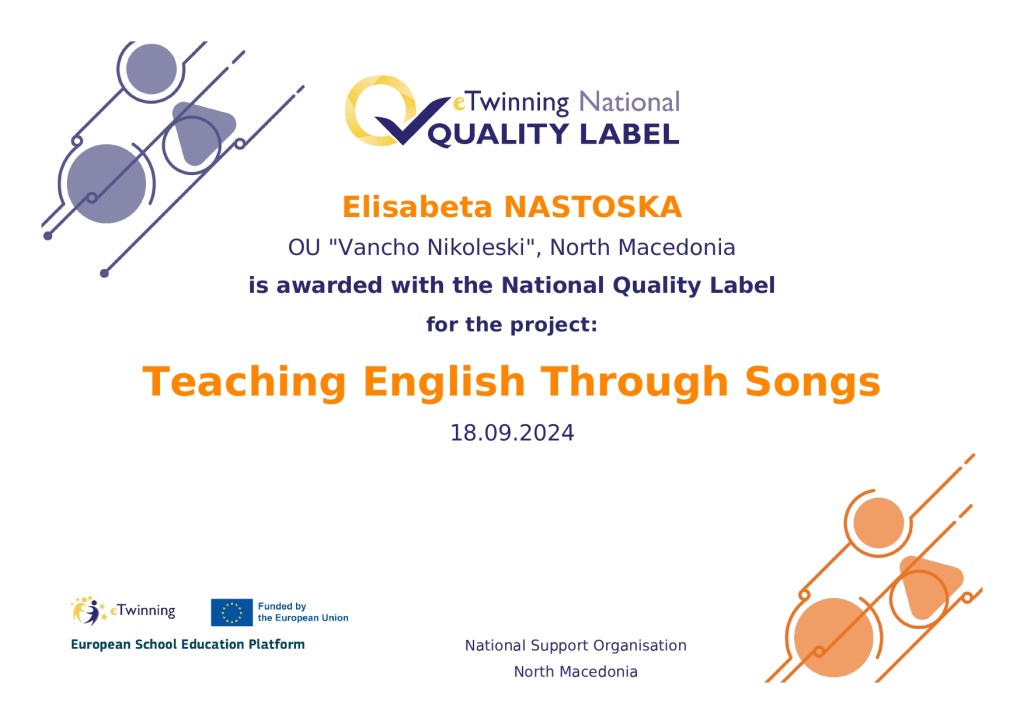 Наставничката Елисабета Настоска заедно со своите ученици, дел од клубот по англиски јазик, минатата година реализираа 3 е-твининг проекти (Травелманија, Учење англиски јазик преку песни и Културни и географски сличности и разлики меѓу јазиците) и за тоа се наградени со Е-твининг Национални ознаки за минатата 2023 /2024 учебна година.